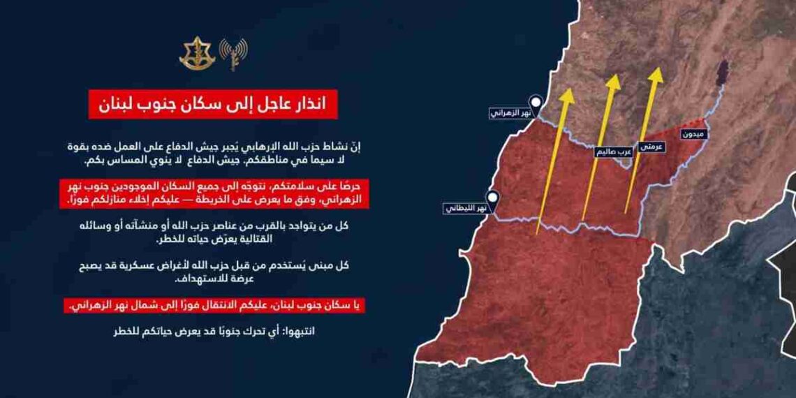 انذار إسرائيلي عاجل إلى سكان جنوب لبنان وخصوصًا سكان القرى جنوب نهر الزهراني