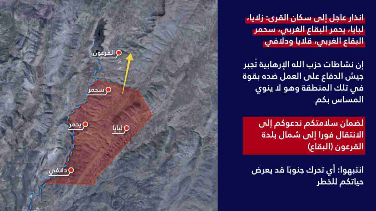 انذار عاجل إلى سكان القرى اللبنانية: زلايا لبايا يحمر (البقاع الغربي) سحمر (البقاع الغربي) قلايا دلافي