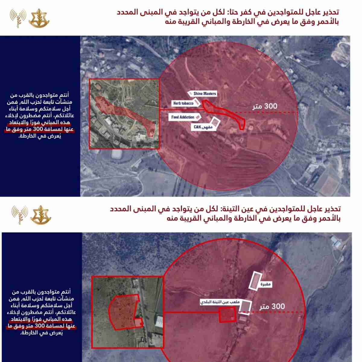 هدّد جيش الاحتلال “الاسرائيلي” السكان المدنيين في بلدتي كفرحتا وعين التينة اللبنانيتين وتحديدًا المتواجدين في المبنى المحدد في الخارطة والمباني المجاورة له بقصفه.وطالبهم بإخلاء هذا المبنى والمباني المجاورة فورًا والابتعاد عنها لمسافة لا تقل عن 300 متر.
