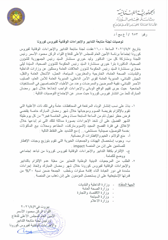 1- بناء على نسب إنتشار الوباء المرتفعة في المحافظات عامة وفي تلك ذات الأغلبية التي تقوم بالالتزام بفريضة الصوم وموجباتها خلال شهر رمضان المبارك خاصة يقتضي فرض حظر تجول تام من الساعة السابعة مساء وحتى الخامسة فجراً من كل يوم طيلة الشهر الفضيل على أن تتخذ الإجراءات بصورة مماثلة لتلك التي تم اتباعها خلال الإغلاق في فترة الفصح المجيد (السوبرماركت، المطاعم ومحلات بيع المأكولات خدمة التوصيل، صيدلية ، مستشفى، … ) مع التشديد على النقاط التالية: