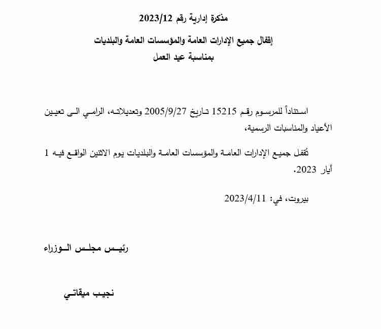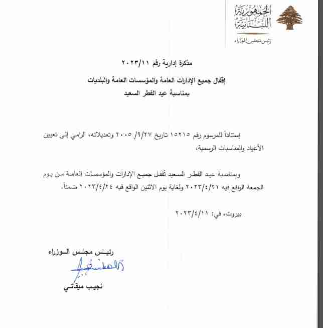 صدر عن رئاسة مجلس الوزراء مذكرتين ادارتين بالاقفال بمناسبة عيد الفطر السعيد، وعيد العمل.