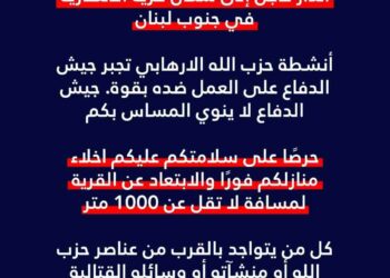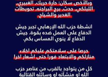 أدرعي: إن.ذار عاجل الى سكان الضاحية الجنوبية وبالأخص سكان الأحياء التالية: – حارة حريك- الغبيري- الليلكي- الحدث- برج البراجنة- تحويطات الغدير – الشياح